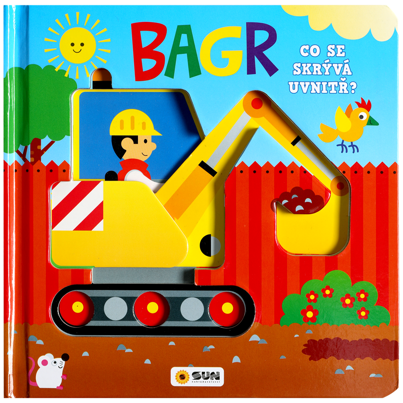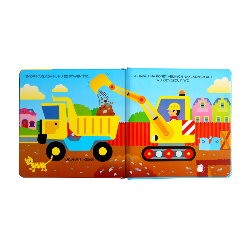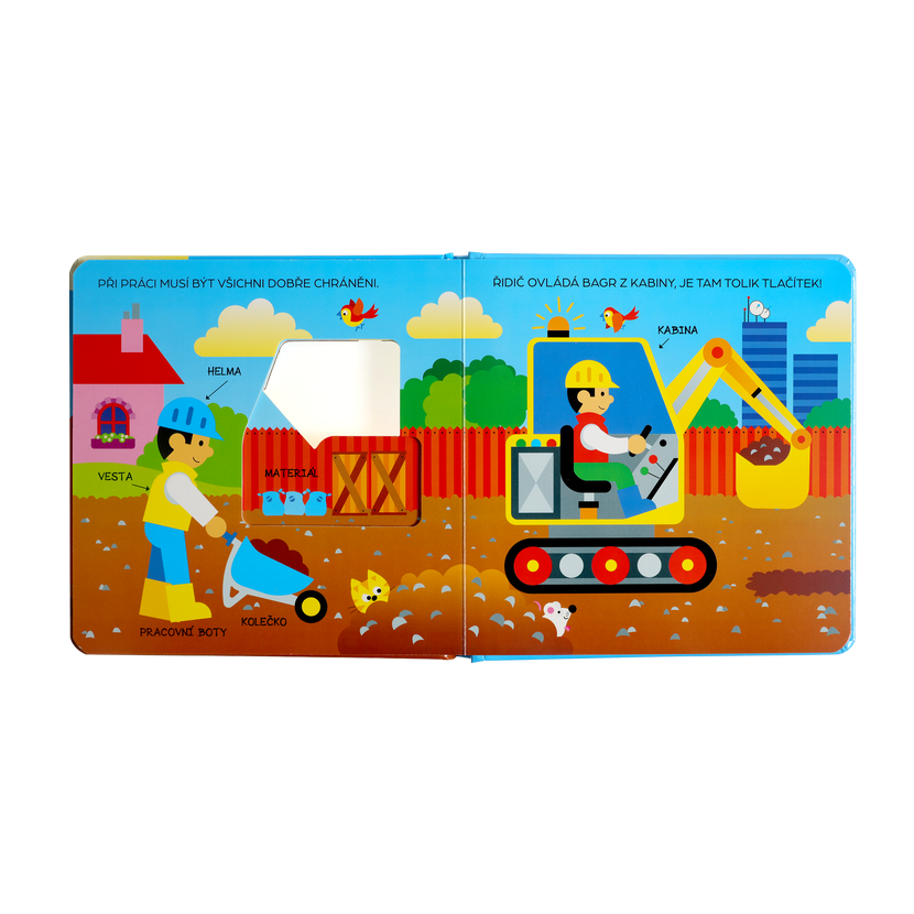 Každá z 10 pevných stránek obsahuje výřezy a okénka, pod kterými se skrývají zajímavosti o stavebních strojích. Děti mohou aktivně objevovat, co se nachází uvnitř bagru – motor, pásy, hydrauliku a další mechanismy. Detailní ilustrace oživují každý stroj a činí učení zábavným a poutavým.