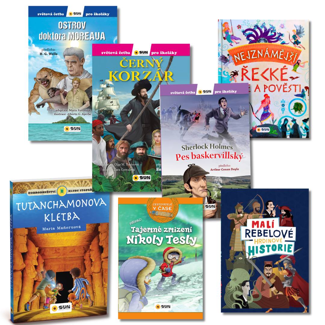 Všechny knihy v balíčku pocházejí z dílny Nakladatelství SUN, které se specializuje na kvalitní, kreativní a vzdělávací knihy pro děti i mládež. Edice Světová četba pro školáky přináší citlivě převyprávěná a zkrácená díla světové literatury v různých úrovních obtížnosti – od růžové řady pro začínající čtenáře až po tmavě modrou řadu pro zdatnější čtenáře od 10 let. Všechny tituly jsou bohatě ilustrované a pečlivě upravené tak, aby zachovaly ducha originálu a zároveň byly přístupné mladým čtenářům.
