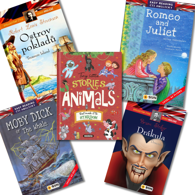 Učení jazyka nemusí být dřina – může to být skvělé dobrodružství! Tento balíček dvojjazyčných (česko-anglických) knih od Nakladatelství SUN vám pomůže rozšířit si slovní zásobu tak, že si ani nevšimnete. Propojili jsme vzdělávání s napínavými příběhy, které zná celý svět. Ušetřete oproti nákupu jednotlivých titulů a využijte čas strávený čtením naplno!