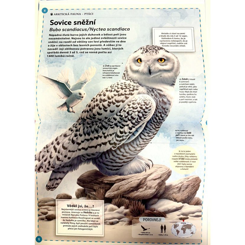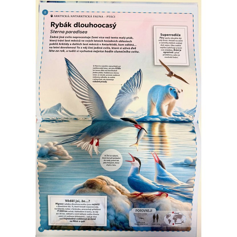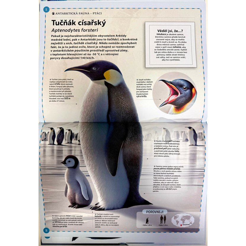 Fascinující svět v zemi sněhu a ledu - Polární zvířata“ přináší okouzlující pohled na úžasné obyvatele odlehlých polárních krajin. S nádhernými ilustracemi se čtenáři vydají do světa ledové mořské vody, bílých plání pokrytých sněhem, ledových kry a nekonečného nebe, kde žije pestrá škála savců, ryb i ptáků, kteří se dokázali přizpůsobit drsným podmínkám severního a jižního pólu. Kniha seznamuje s životními zvyky a charakteristikami živočichů žijících v Severním ledovém oceánu, Jižním oceánu, na arktických ostrovech i na ledové Antarktidě. Čtenáři poznají fascinující příběhy, například plejtváka obrovského, který proplouvá vody obou oceánů, nebo rybáka dlouhoocasého, jenž každoročně urazí neuvěřitelných 71 000 km mezi Antarktidou a Arktidou. Tato kniha nabízí hluboký a poutavý vhled do života obyvatel lední říše a jejich unikátních strategií přežití v extrémních polárních podmínkách. Díky velkoformátovým ilustracím se tato velká XXL encyklopedie určitě stane chloubou vaší rodinné knihovny.
