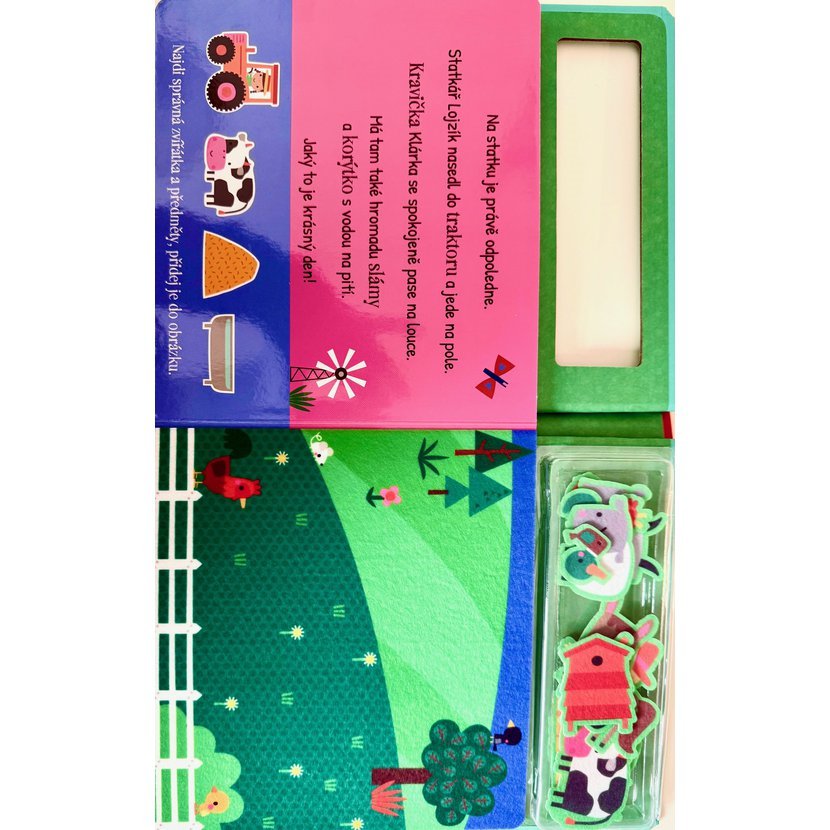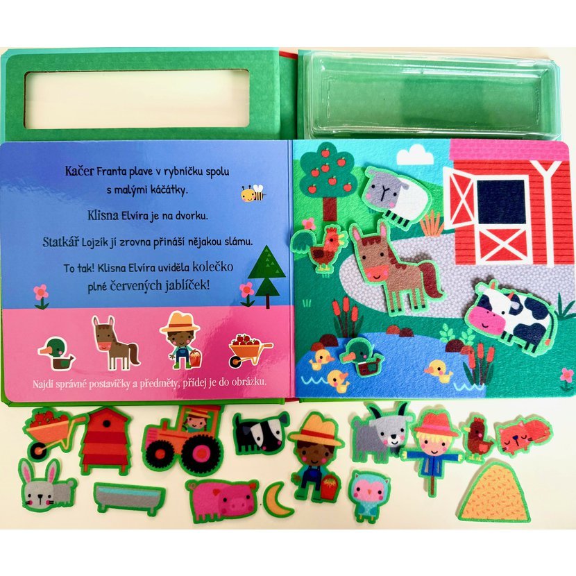 Vydejte se s námi na statek za zvířátky a staňte se hlavním vypravěčem vlastního příběhu! Tato hravá knížka nabízí pět zábavných scén s plstěnými deskami a 20 plstěnými samolepkami, které lze opakovaně skládat a přemisťovat. Děti si mohou sestavit vlastní scénky se zvířátky, kolečky, statkářem Lojzíkem, traktorem a dalšími zvířátky i věcmi ze statku.
