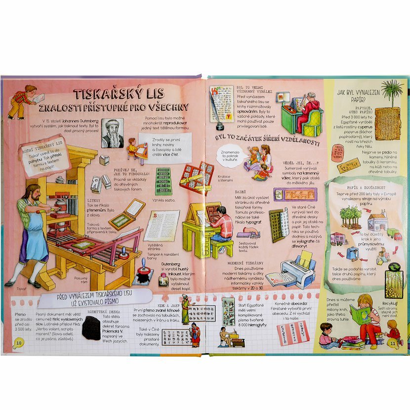 Cesta technologickým pokrokem: Kniha provede děti celou historií lidských vynálezů - od prvních jednoduchých nástrojů pravěkých lovců až po sofistikované technologie 21. století.