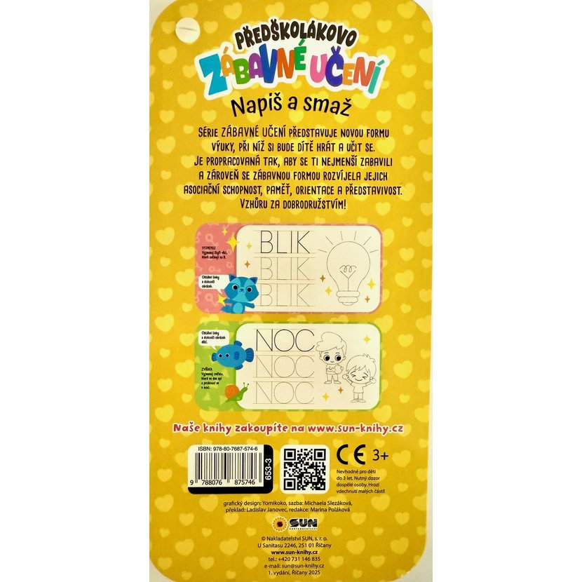 Knihu lze použít pro přípravu na školní zápis. Učení tvarů, tahů a čar, děti rozvíjí jejich zrakové vnímání, prostorovou orientaci, jemnou motoriku a schopnost rozlišovat a porovnávat předměty podle velikosti, barvy a tvaru. Tyto dovednosti jsou důležité pro správné pochopení a zvládnutí psaní a dalších školních dovedností. Tyto úkoly se často objevují při zápisu do školy. Kniha má praktický a příjemný formát, je k ní připojena mazací fixka, kterou děti mohou tahy snadno smazat, opravit a opakovat úkoly znovu. Celá koncepce je chytrá, zábavná a šetrná. Vstupte s nimi do světa dobrodružství, kde učení není nikdy nudné!