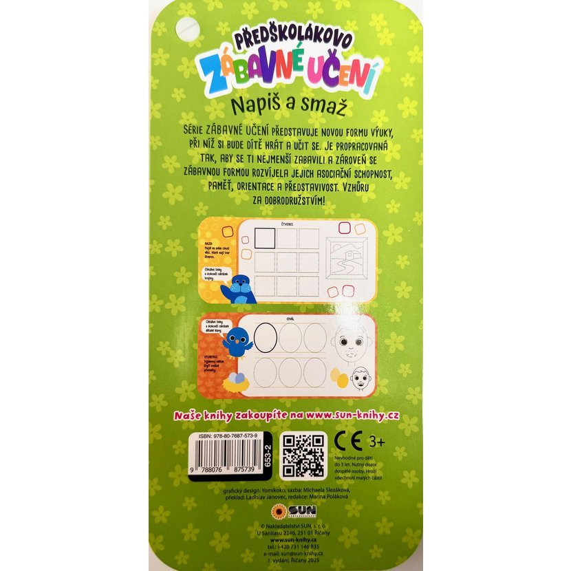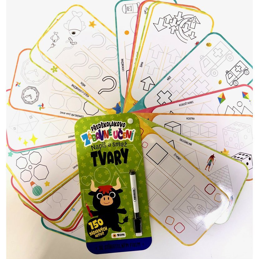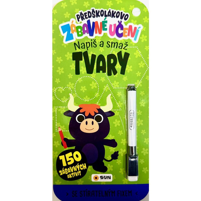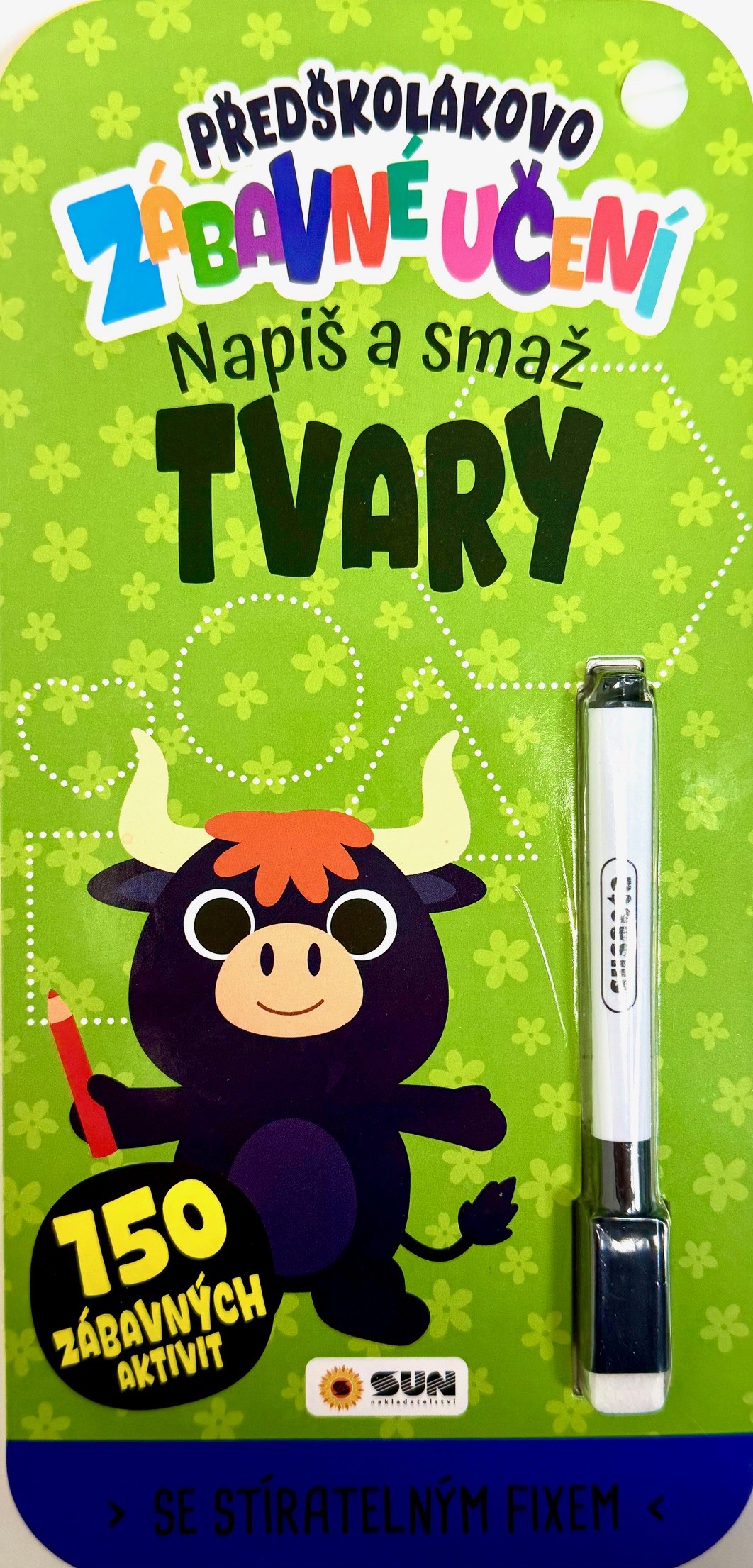 Kniha 150 zábavných aktivit – Předškolákovo zábavné učení: TVARY - napiš a smaž - představuje novou, hravou formu výuky, která děti nejen pobaví, ale zároveň rozvíjí jejich asociační schopnosti, paměť, orientaci i představivost.