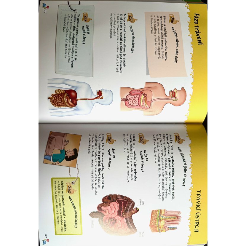 Kniha je členěna do přehledných kapitol zaměřených na jednotlivé části a systémy lidského těla: pohybové ústrojí, oběhovou soustavu, imunitní systém, dýchací ústrojí, trávicí ústrojí, endokrinní systém, krycí soustavu, močové ústrojí, nervovou soustavu, smysly a reprodukční soustavu. Formát jednoduchých otázek a odpovědí v krátkých boxech umožňuje dětem snadno pochopit složité informace a zároveň je motivuje k dalšímu objevování tajemství lidského těla, plného fascinujících faktů a detailů.