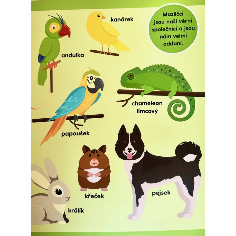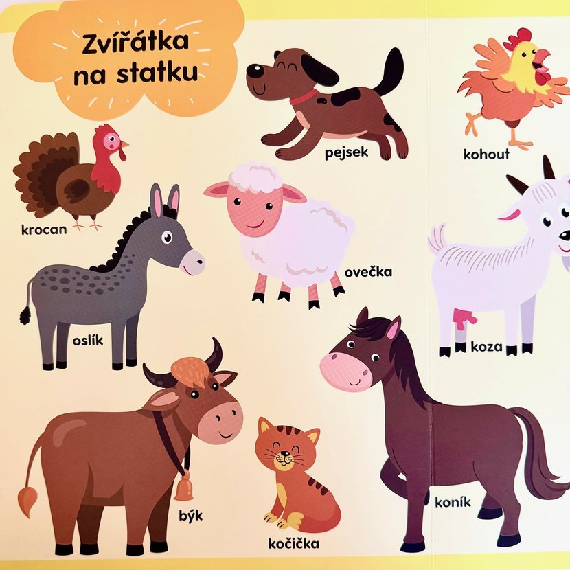 Na stránkách děti objeví zvířátka z různých prostředí – zvířátka v divočině, na statku, domácí mazlíčky i obyvatele moří. Knížka je přehledně rozdělená do tematických sekcí, takže se v ní děti snadno orientují a postupně si rozšiřují slovní zásobu.